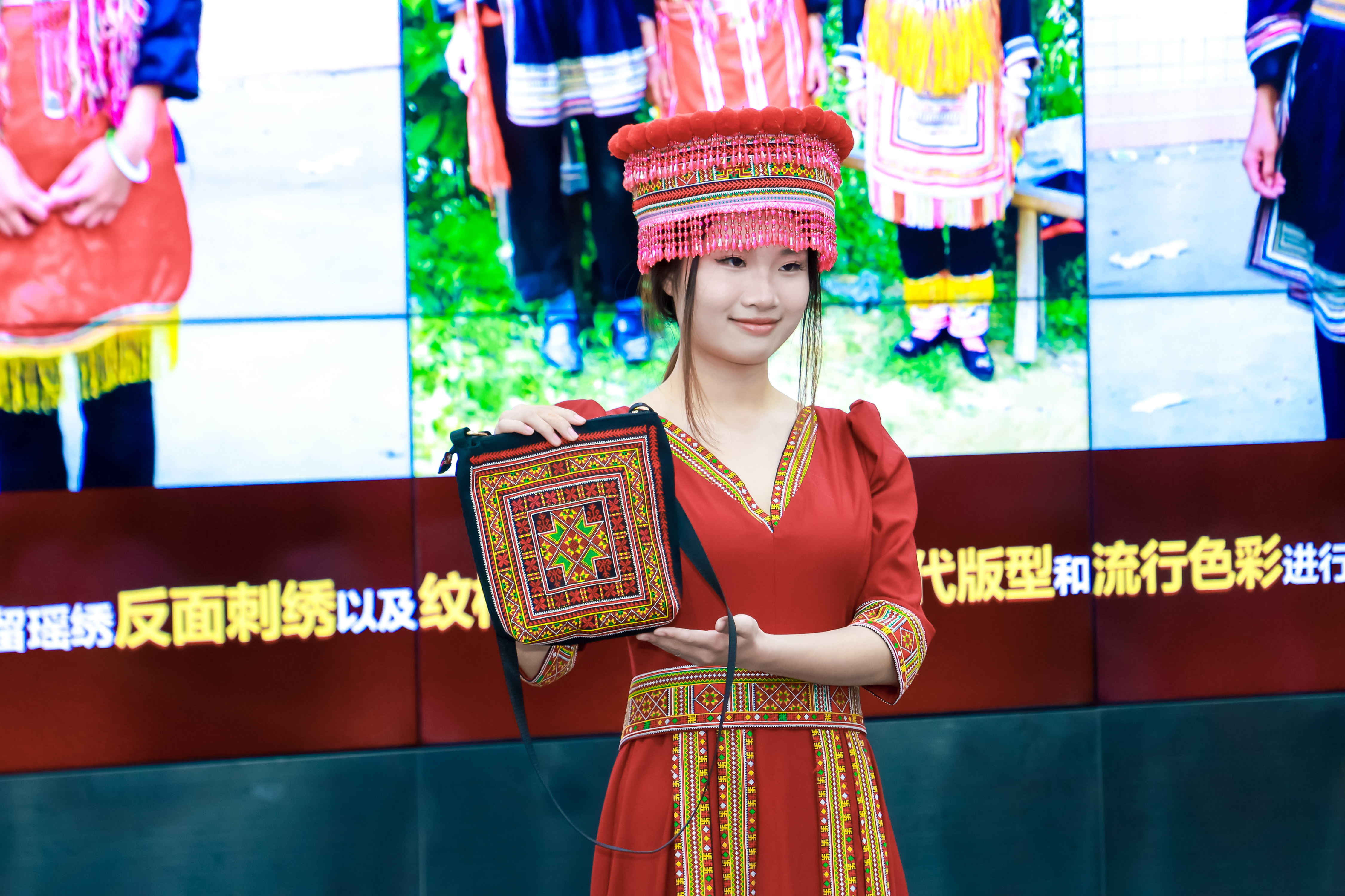 广东外语外贸大学瑶篮瑶绣实践团成员展示改良瑶绣服饰。